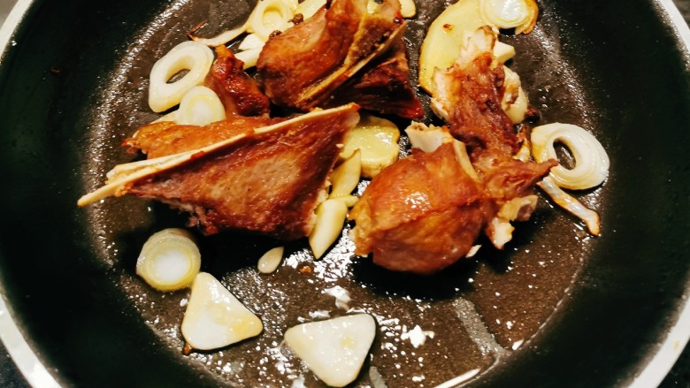 10. 锅中留下底油 多余的油倒出留作它用 加热放入葱姜蒜片 炒出香味