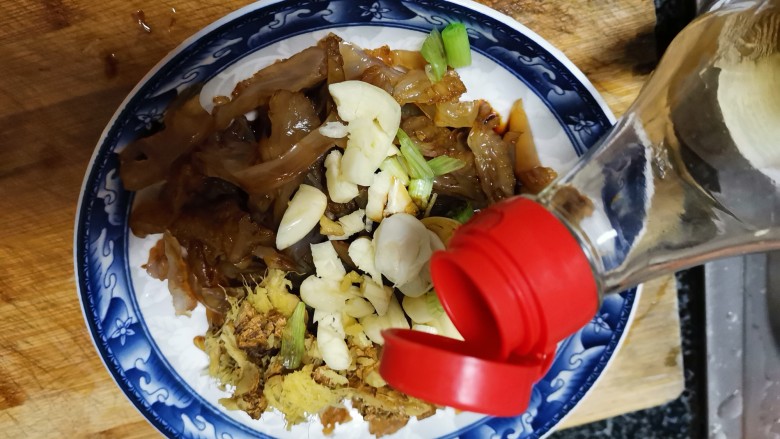 6. 葱姜蒜全部加到海蜇皮上面