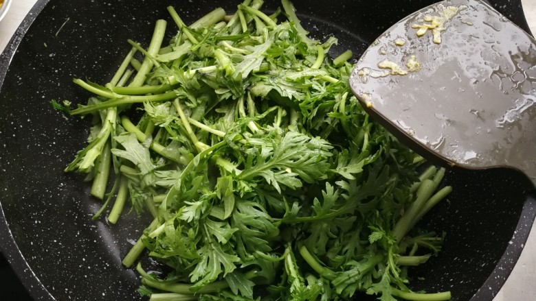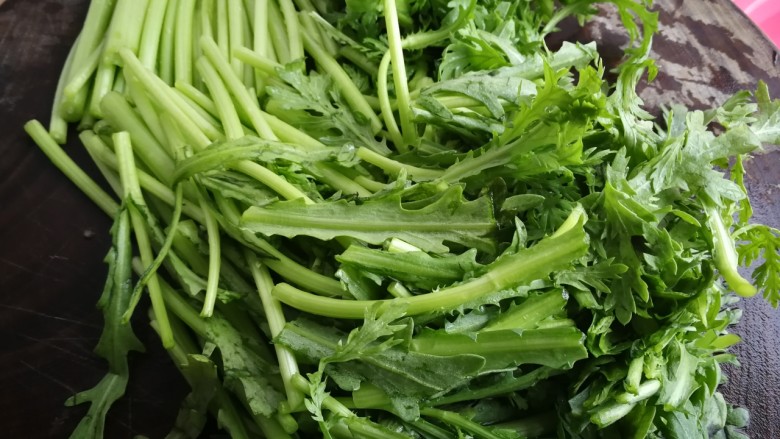 2. 茼蒿冲洗一下,清水浸泡十分钟,再冲洗沥掉水