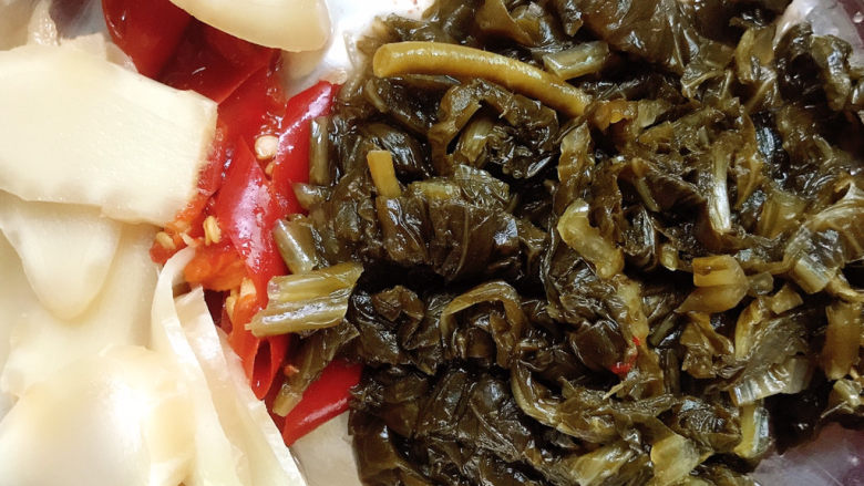 2. 泡姜泡辣椒切片,泡青菜切碎