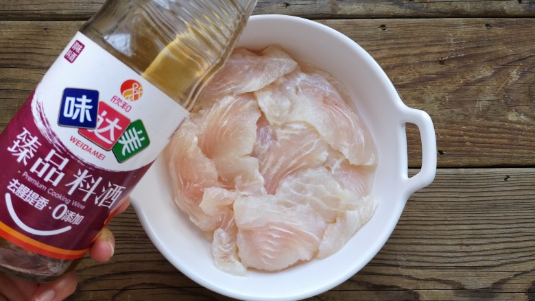 3. 在片好的龙利鱼片中加入一勺料酒。