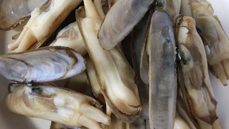 1. 蛏子洗净静养一会,加一勺盐让它吐沙,也可以买市场上养好的,比较的方便