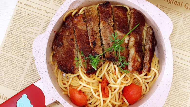 13. 煎牛排的锅中留少许油,放入意大利面