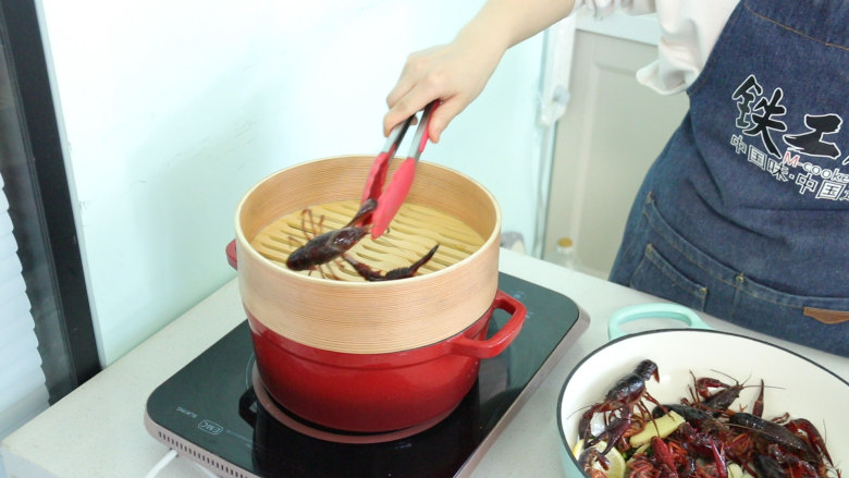 15. 将腌制好的小龙虾放入蒸屉