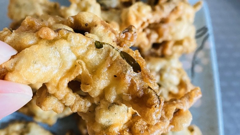 10. 油温烧至7成热,加一两片香椿试炸,冒泡就可以继续放香椿。