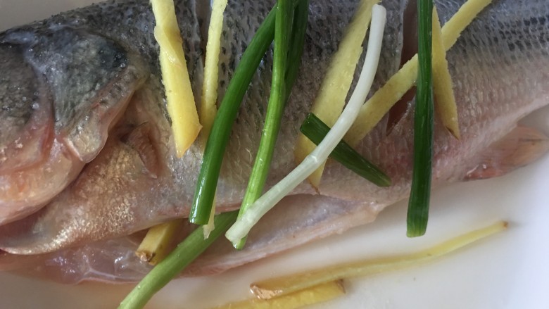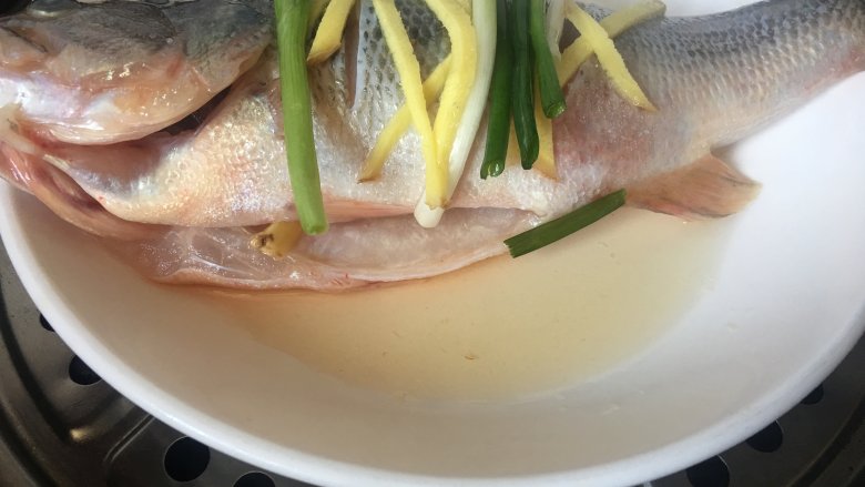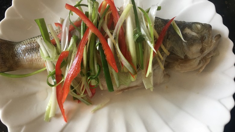 10. 鱼蒸好后把盘子的水倒掉,然后放上葱丝,生姜丝和红椒丝