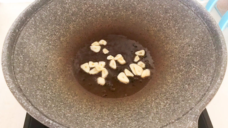 9. 炒锅烧热后加入花生油,油烧热后加入蒜片炒出香味