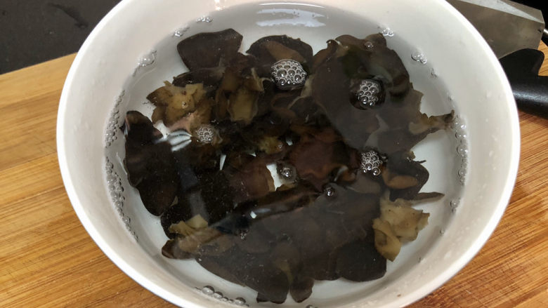8. 泡发好的木耳水下揉搓洗净,撕成小朵备用