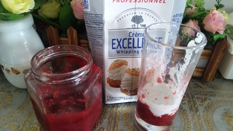 - 1.杯中入适量草莓酱,将其挂壁,加适量淡奶,倒满牛奶,拌匀即可