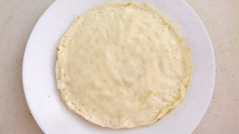 9. 接着做蛋清饼,炒锅烧热后刷一层花生油,加入蛋清液,煎成蛋清饼