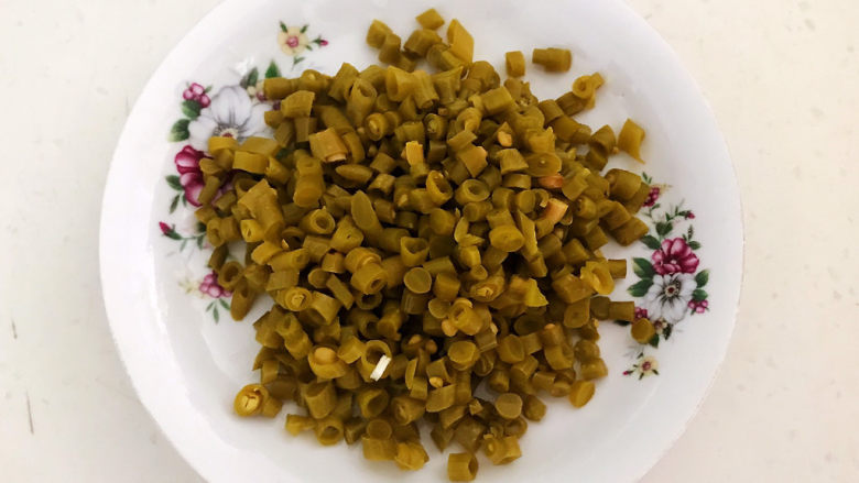 2. 把豇豆切成小丁,用泡豇豆做出来的菜品口感更佳独特
