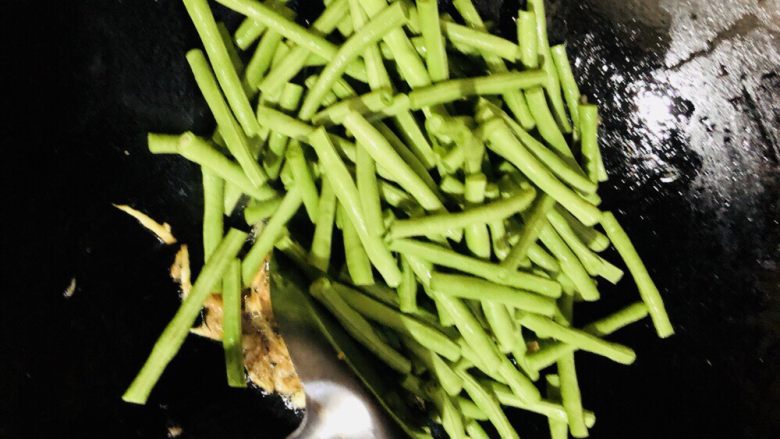 15. 放入豇豆翻炒