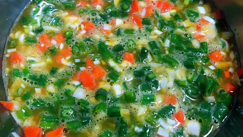 9. 锅中倒入底油加热倒入拌匀的豇豆胡萝卜蛋液