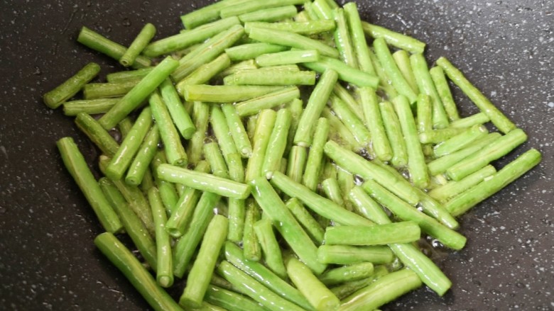 6. 炒锅内倒多一点食用油烧热,下入豇豆段。