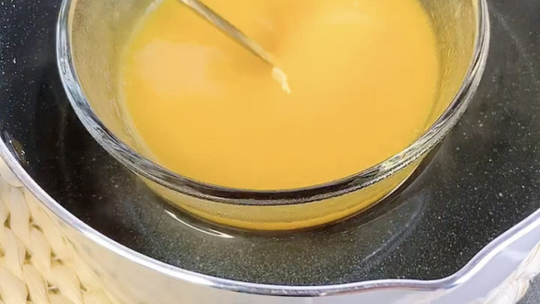14. 这时候调一个镜面,50克芒果泥,加50克清水,5克吉利丁