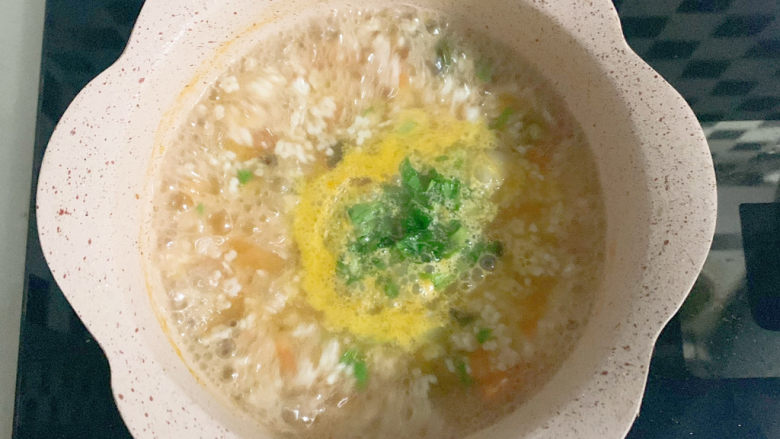 7. 水开后下入小花星星面。下入青菜碎,加入少量的盐。小火煮3-4分钟。关火焖1分钟。
