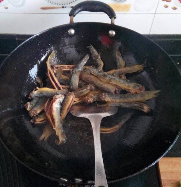6. 泥鰍炸定型后,倒出少许油,在锅中小火煎……