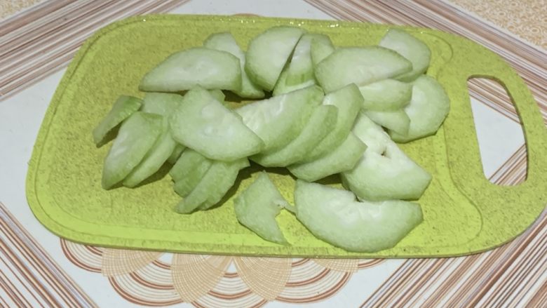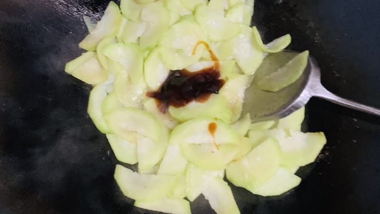 12. 快速翻炒均匀,让每片节瓜粘上油,看油准备干的时候加水。