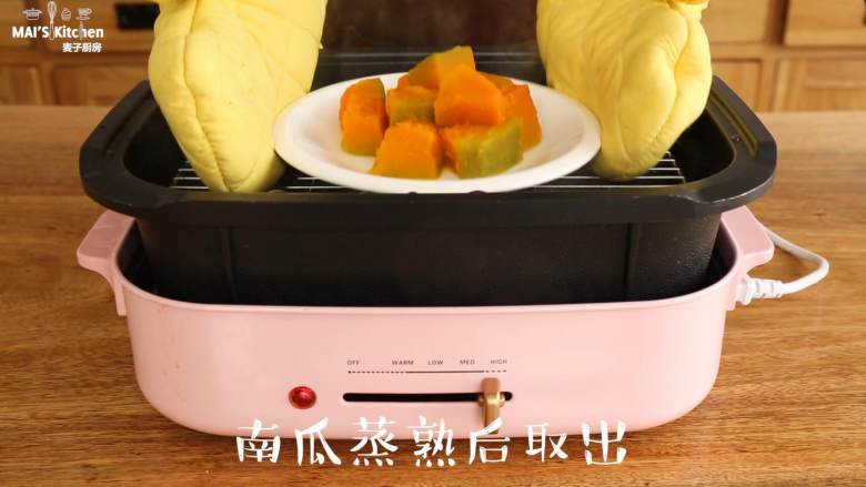 1. 南瓜使用美食锅蒸熟,取出倒入调理盆中