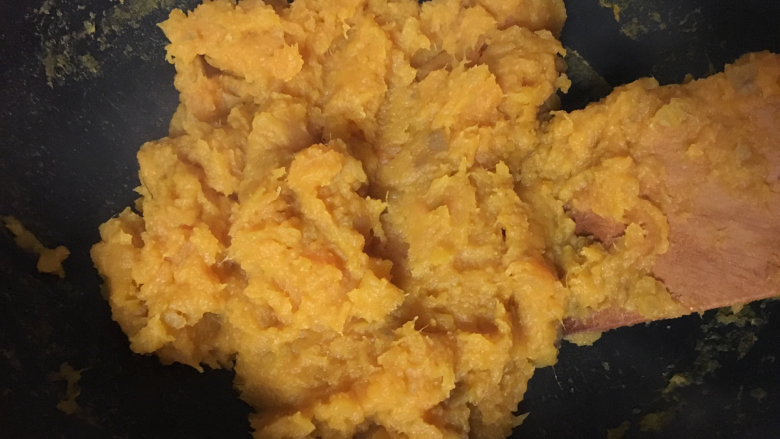 17. 红薯泥边炒边压碎,也可以用料理机打碎,但我觉得失去了红薯的纤维感,所以采用压碎的方法保留粗糙一点的质感;