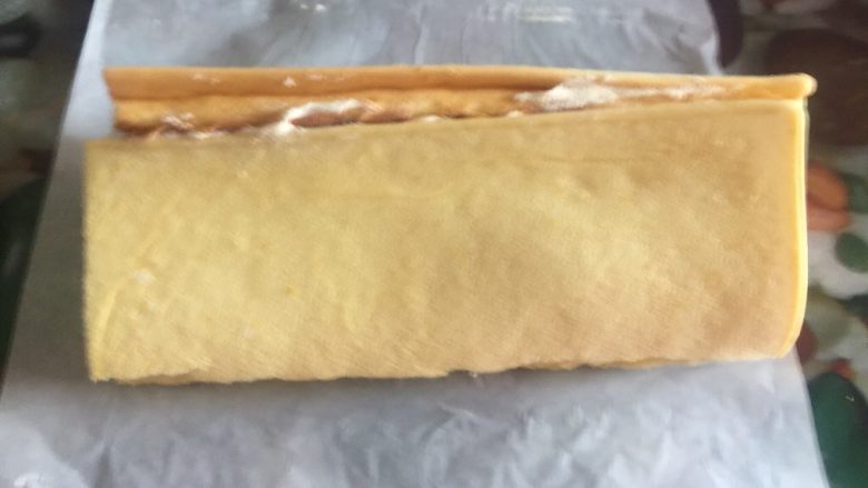 24. 上下均盖上一层油纸,防止蛋糕卷暴露在空气中失去水份。