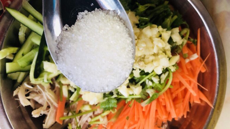 17. 将鸡胸肉和胡萝卜放入调料盆中。