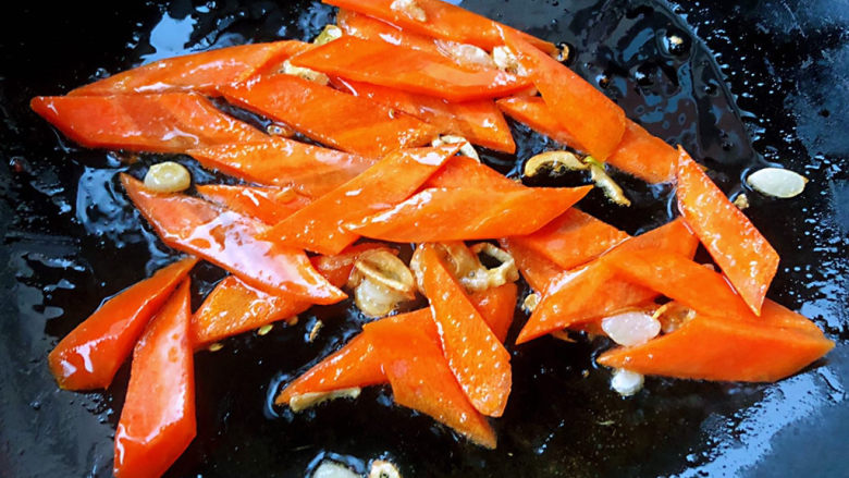 7. 锅中倒入底油加热放入蒜爆香再放入胡萝卜片炒匀