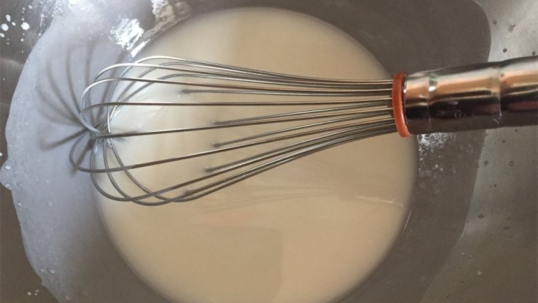 3. 用蛋抽把蛋黄和乳化后的牛奶色拉油溶液搅拌到一起,再次搅拌至均匀状态。