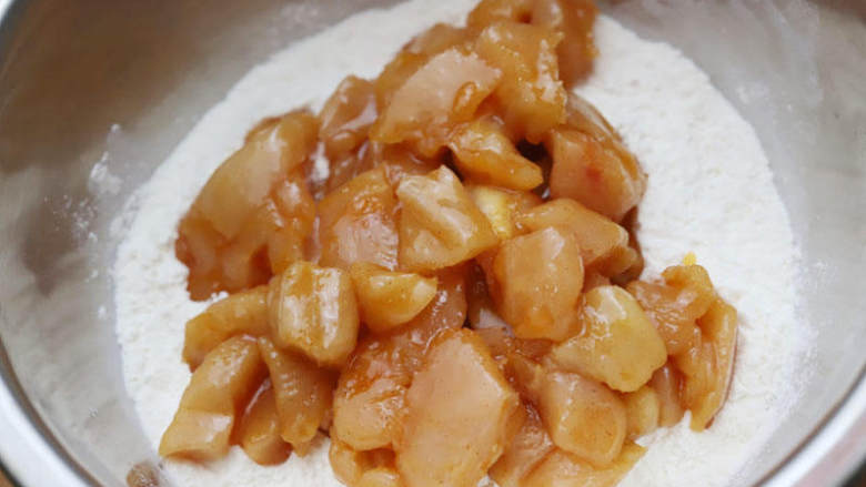 4. 用手抓揉,让鸡块均匀地裹上面粉,这个动作反复重复,粉类厚厚裹一层。
