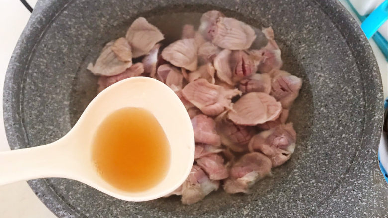 10. 鸡胗冷水下锅,加入姜片和葱段,大火烧开后煮10分钟