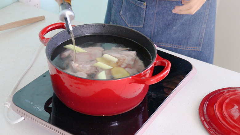 4. 锅开后去除浮沫,将猪蹄儿捞出