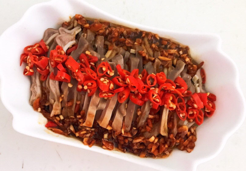 18. 加入碗汁和小米辣,凉拌猪肚丝做好了~