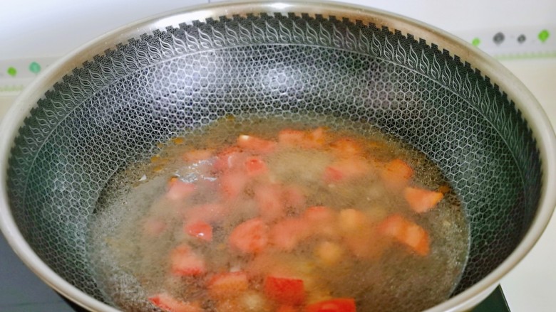 7. 起油锅,加入蒜末炒香,再加入切好的番茄翻炒。