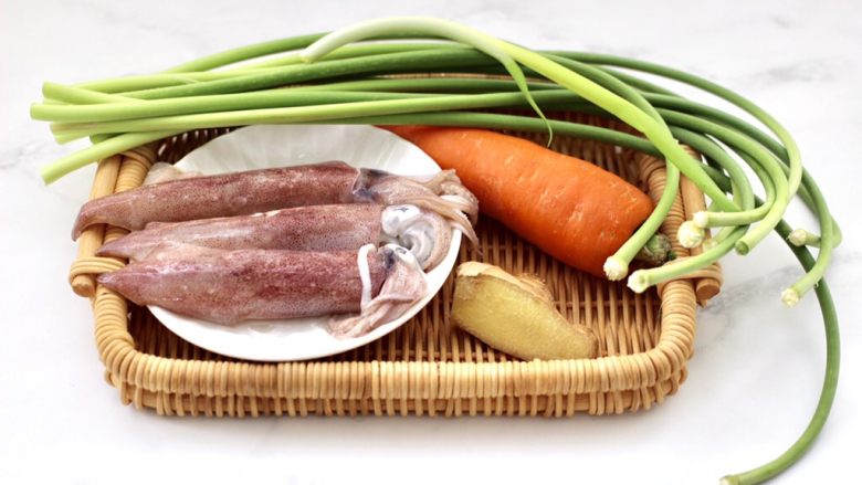 2. 先把鱿鱼的内脏去除干净后,眼睛去掉,头尾分开冲洗干净。