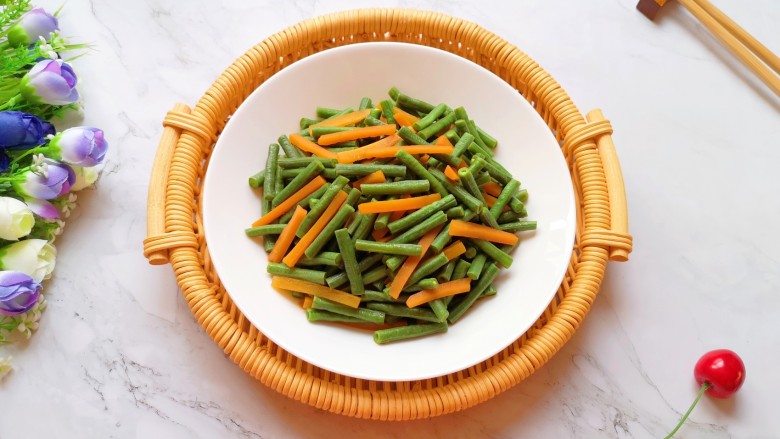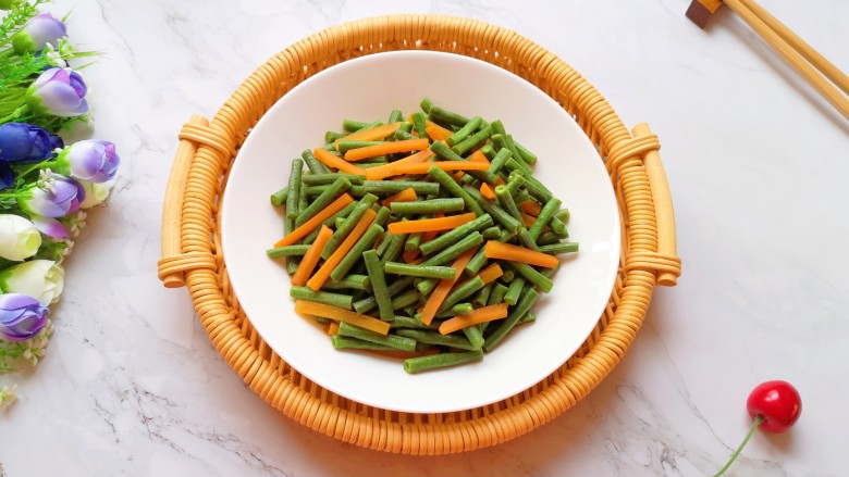 4. 锅内放水烧开,下入豇豆和胡萝卜,烧开以后焯水2分钟关火。