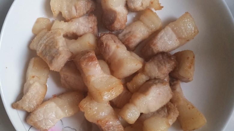5. 国内倒入少许油,放入五花肉小火炒,把多余的油脂炒出来