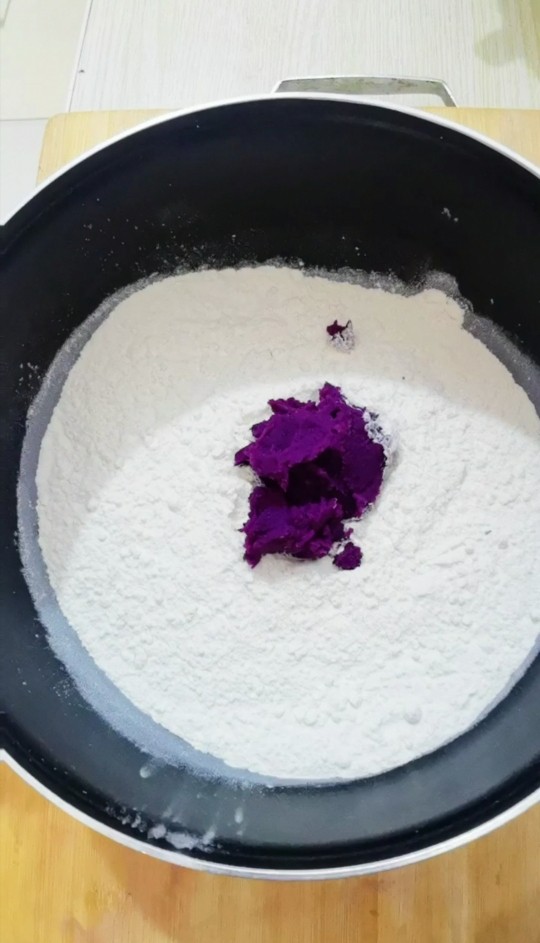 8. 盆里放入面粉,加入紫薯泥