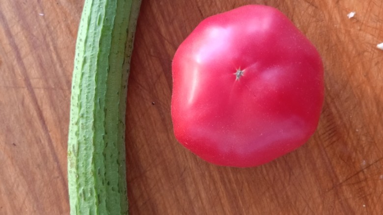 2. 准备一下材料,一根丝瓜和一个大的西红柿。