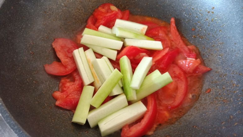 11. 在炒出汤汁后,将丝瓜到入西红柿中间。