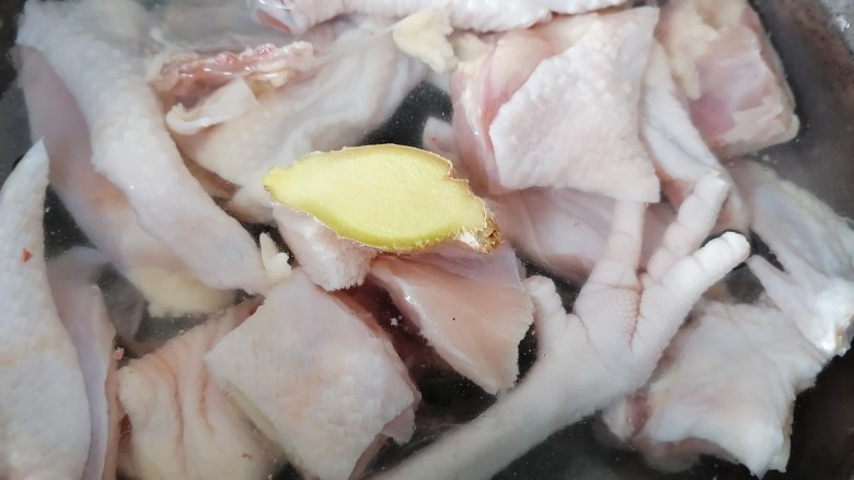 5. 将鸡肉放入锅内焯水
