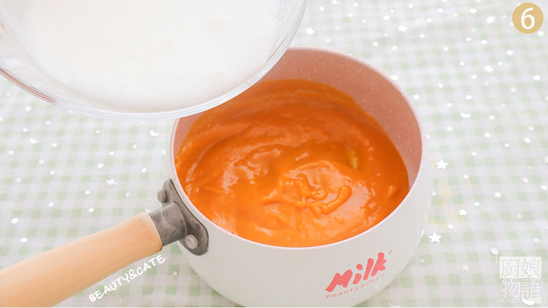 4. 把芒果泥倒入奶锅中,加入泡软的吉利丁片,小火搅拌至融合。(注意不要加热到起泡哦~)