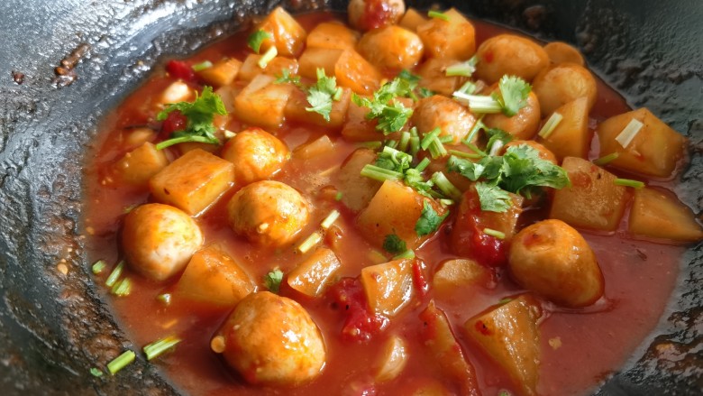 鹌鹑蛋先煎后焖,外面的蛋皮吃起来有韧性且有嚼劲,土豆绵软,混合着酸酸甜甜的番茄汤汁,每一口都超级满足。