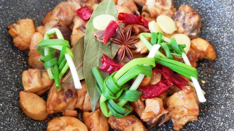 7. 下入小葱结、生姜片、干红辣椒、八角、桂皮和香叶炒香。
