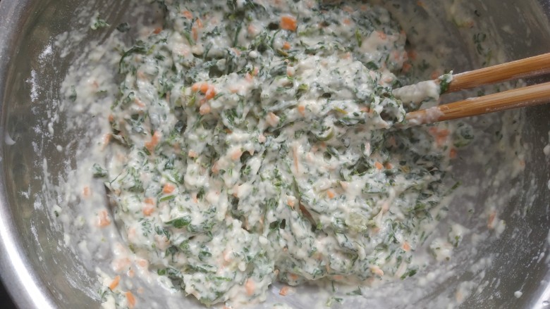 8. 煎锅放油烧热,把面糊用勺子舀入锅中