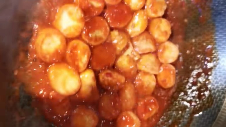 13. 把炸至金黄的日本豆腐放入准备汤汁,然后让豆腐收汁。