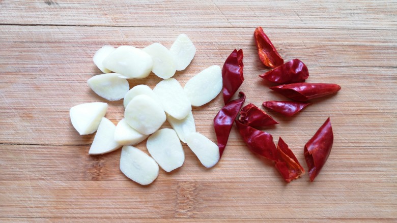 7. 炒锅内倒适量的食用油烧热,下入蒜片和辣椒段炒香。