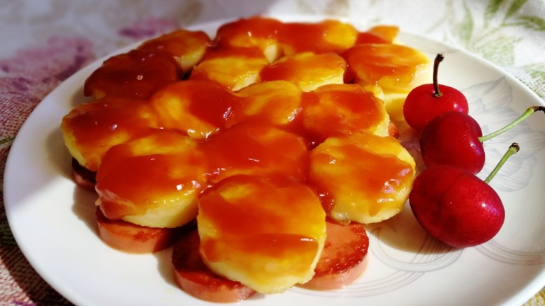 11. 煎至两面金黄即可,盛出平铺在火腿肠上面。