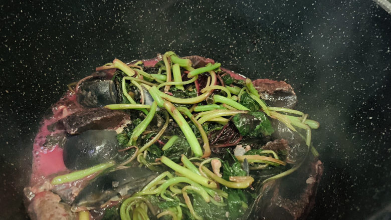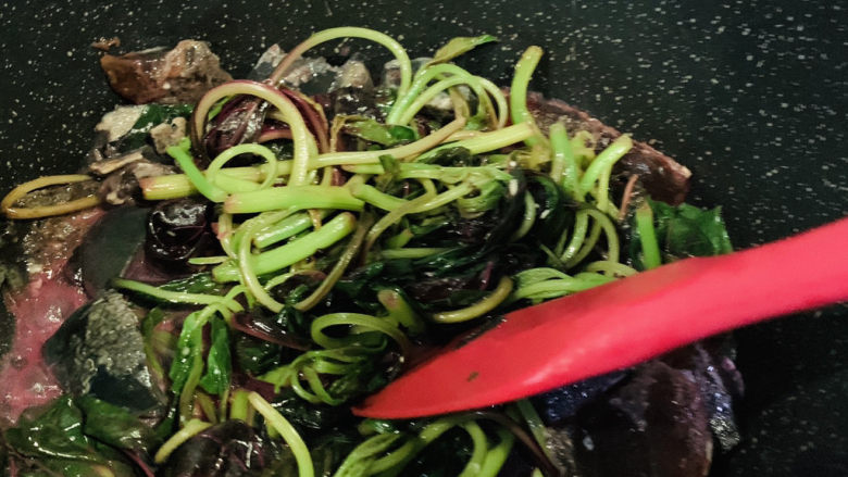 苋菜,小时候都叫它“红红菜”,那时候家人喜欢搭配线面煮,现在我喜欢用皮蛋来炒苋菜,味道特别好!