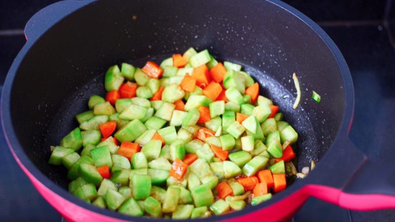 6. 马克西姆微压锅烧热后倒入花生油烧热,爆香葱姜,再放入胡萝卜继续翻炒。