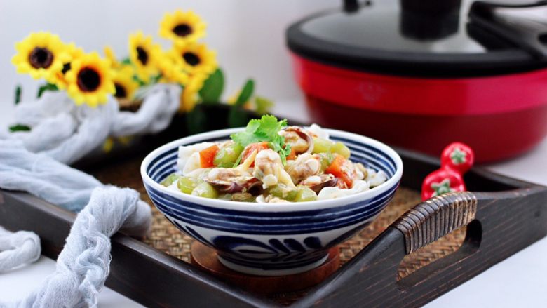 16. 加入煮熟的飞蛤,撒上香菜段即可关火。